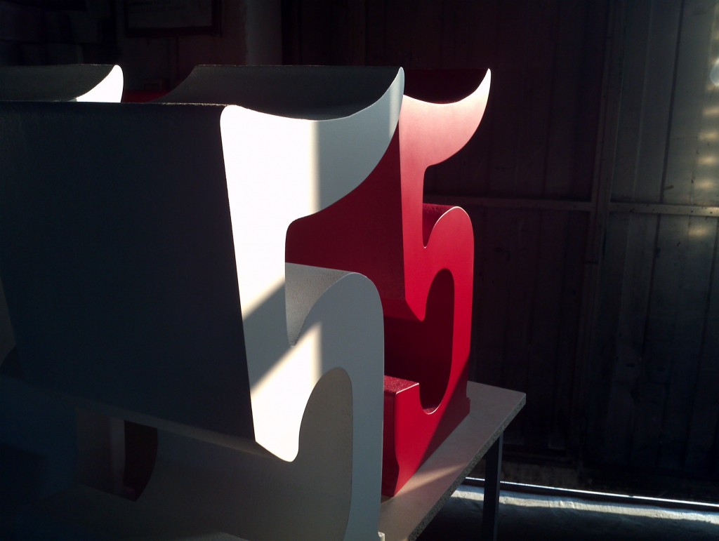 Preview dalla verniciatura VOLTAN, sgabelli Five appena verniciati si ambientano nella loro nuova vita da pezzi di design.